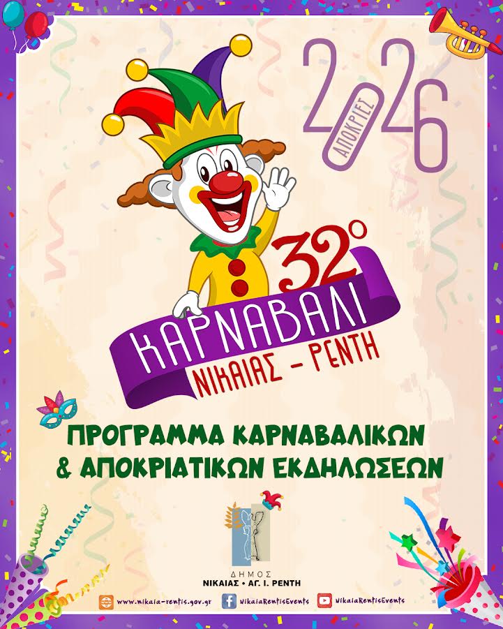 Ο Δήμος Νίκαιας- Αγίου Ιωάννη Ρέντη, προσκαλεί κατοίκους και επισκέπτες στο 32ο Καρναβάλι Νίκαιας- Ρέντη, έναν θεσμό που μετατρέπει την πόλη σε μια μεγάλη αποκριάτικη σκηνή. Οι πλατείες της Νίκαιας και του Ρέντη θα φιλοξενήσουν δωρεάν εκδηλώσεις για παιδιά, γεμάτες παιχνίδι, μουσική, χορό και δημιουργικές δράσεις.