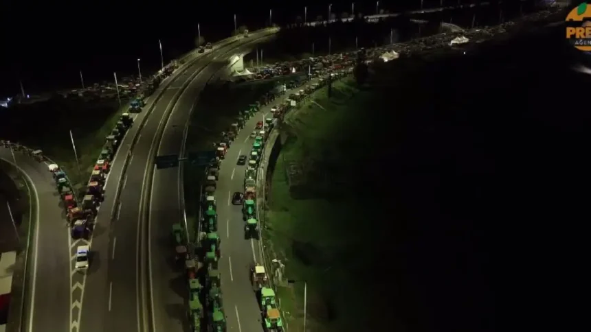 Οι εικόνες από drone του πρακτορείου Orange στο μπλόκο της Νίκαιας τη νύχτα της Πρωτοχρονιάς με τα εκατοντάδες τρακτέρ πάνω στον δρόμο, είναι εντυπωσιακές. Μια ατέλειωτη σειρά από φώτα και σιδερένιους όγκους μέσα στο σκοτάδι, σκηνές με αναμμένα φώτα και βαρέλια με φωτιά για το τσουχτερό κρύο.