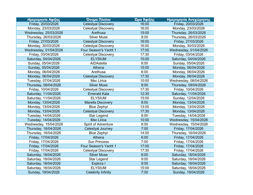 Στις 20 Μαρτίου αρχίζει η νέα τουριστική περίοδος κρουαζιέρας στη Μύκονο, σύμφωνα με ανακοίνωση του Δημοτικού Λιμενικού Ταμείου.