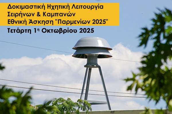 Ο Δήμος Νίκαιας – Αγ.Ι. Ρέντη ενημερώνει τους πολίτες ότι, σε υλοποίηση του υπ’ αριθμ. 5325/1/50-ιγ’ εγγράφου της Υπηρεσίας ΠΑΜ – ΠΣΕΑ του Υπουργείου Προστασίας του Πολίτη, την Τετάρτη 1η Οκτωβρίου 2025 θα πραγματοποιηθεί ηχητική δοκιμή των Σειρήνων Συναγερμού της Πολιτικής Άμυνας, καθώς και των καμπανών των εκκλησιών, στο πλαίσιο της Εθνικής Διακλαδικής Άσκησης ΤΑΜΣ «Παρμενίων 2025».