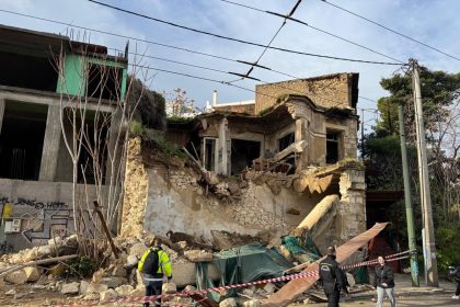 Συνεργεία έσπευσαν επί τόπου ώστε να αντιμετωπίσουν το πρόβλημα που δημιουργήθηκε με την πτώση του κτιρίου στο πεζοδρόμιο και τον δρόμο.