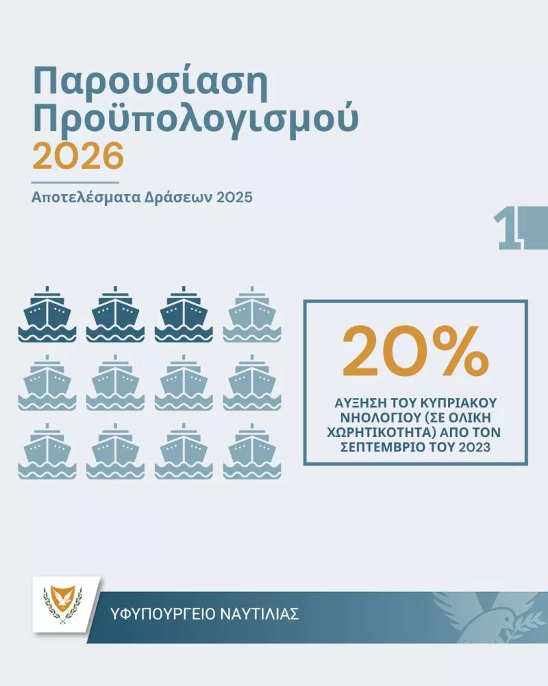 Το Υφυπουργείο Ναυτιλίας της Κύπρου και η υφυπουργός Μαρίνα Χατζημανώλη, παρουσίασαν σήμερα τον Προϋπολογισμό για το έτος 2026 καθώς και τα αποτελέσματα των δράσεων που υλοποιήθηκαν τη χρονιά 2025.
