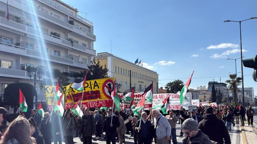 Η πορεία ξεκίνησε από το Πάρκο Ελευθερίας με το κεντρικό πανό να γράφει «Σπέρνουν τον όλεθρο στη Μέση Ανατολή. Έξω η Ελλάδα από τη σφαγή».