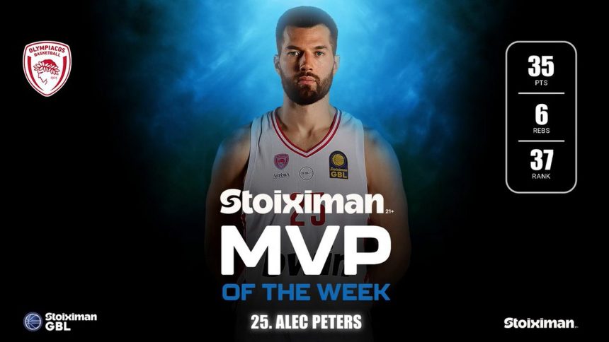Στα χέρια του Άλεκ Πίτερς κατέληξε το βραβείο του πολυτιμότερου παίκτη της εβδομάδας, στο ελληνικό πρωτάθλημα.