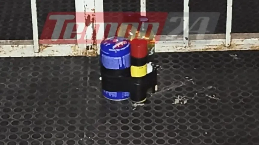 Όπως φαίνεται και στις φωτογραφίες, ο εκρηκτικός μηχανισμός που ευτυχώς δεν πυροδοτήθηκε, περιελάμβανε γκαζάκι και δύο φιάλες εύφλεκτο υλικό.