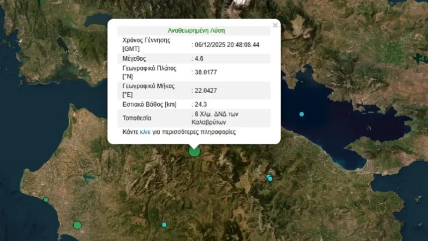 Σεισμός 4,6 βαθμών της κλίμακας Ρίχτερ σημειώθηκε το βράδυ του Σαββάτου (6/12) στα Καλάβρυτα.